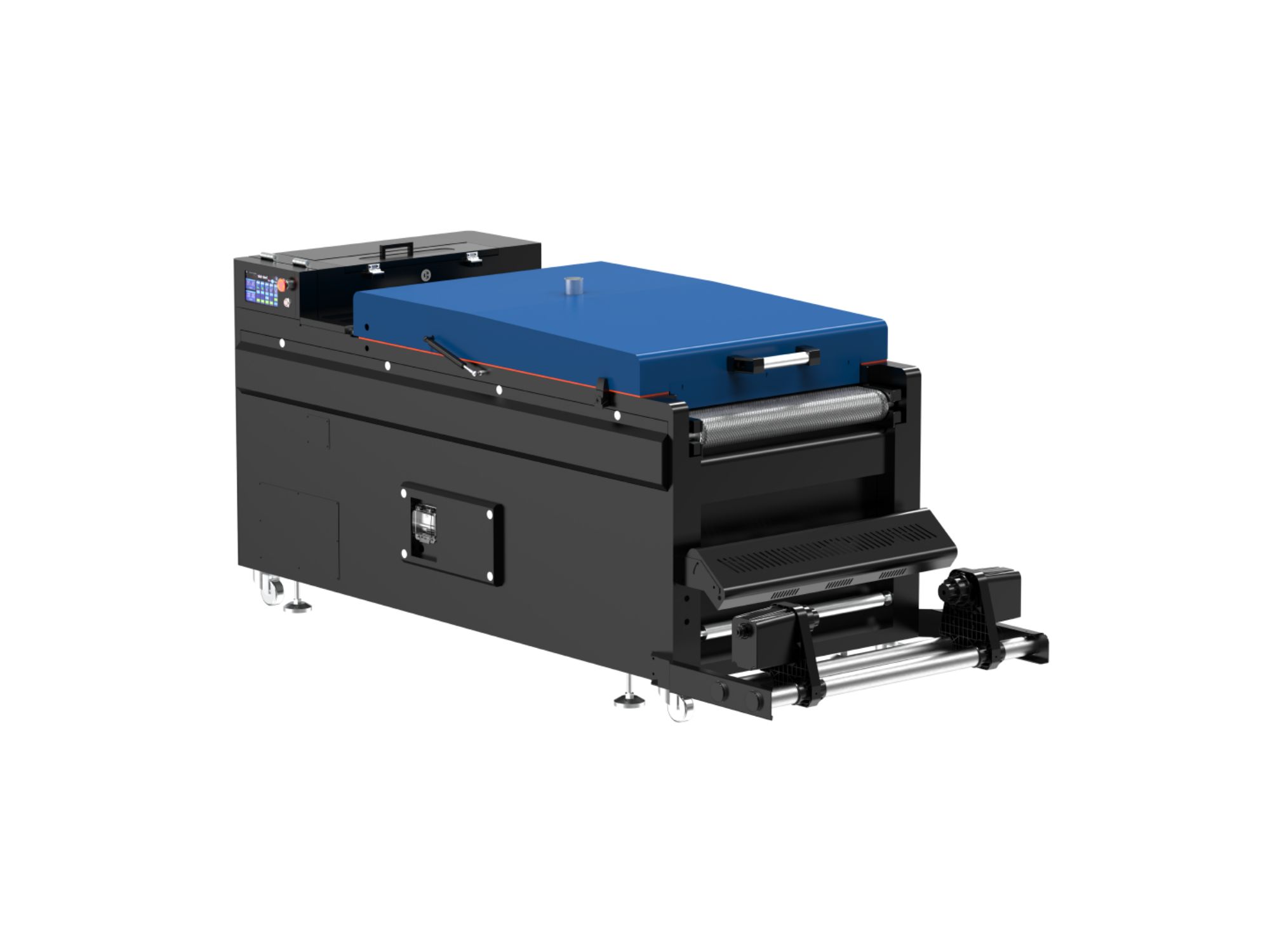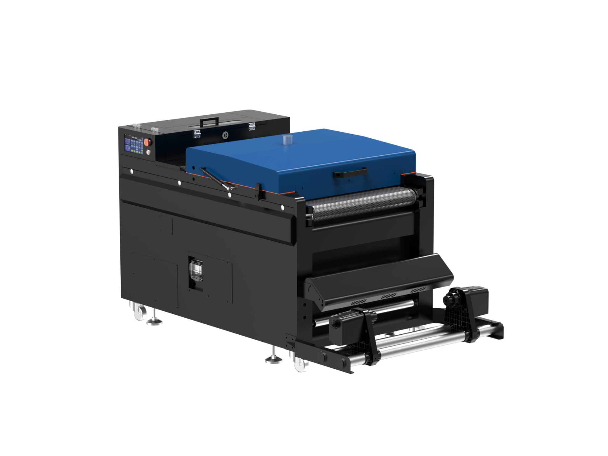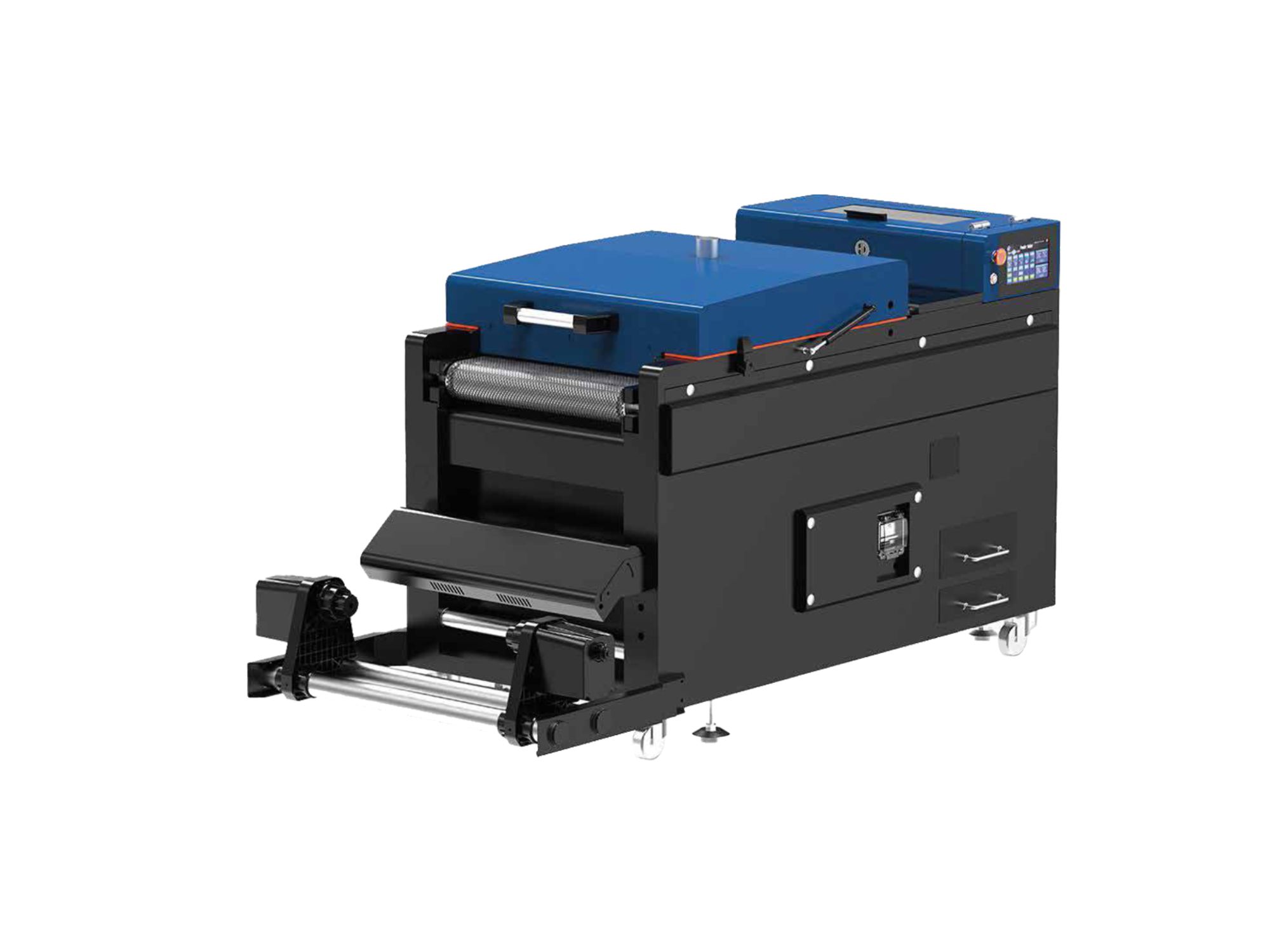 - Flujo de trabajo totalmente automatizado : Impresión automática, corte de película, aplicación y agitación de polvo, horneado.